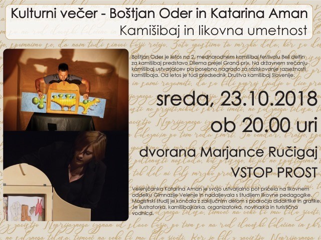 Kulturni večer Kamišibaj in likovna umetnost - gosta Boštjan Oder in Katarina Aman, v sredo, 23. oktobra 2019, ob 20. uri, v dvorani Marjance Ručigaj.