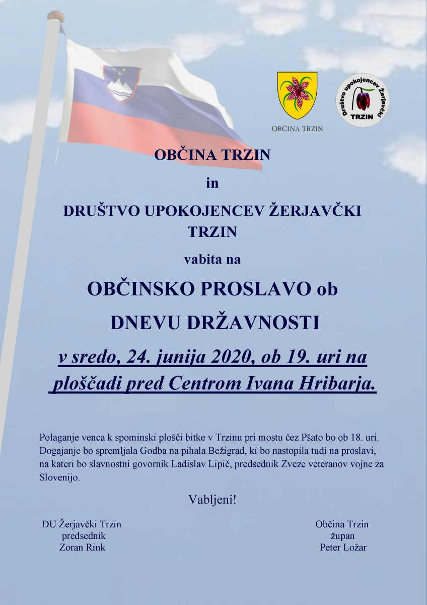 Občina Trzin in Društvo upokojencev Žerjavčki Trzin vabita na OBČINSKO PROSLAVO OB DNEVU DRŽAVNOSTI, ki bo v sredo, 24. junija 2020, ob 19. uri, na ploščadi pred Centrom Ivana Hribarja.