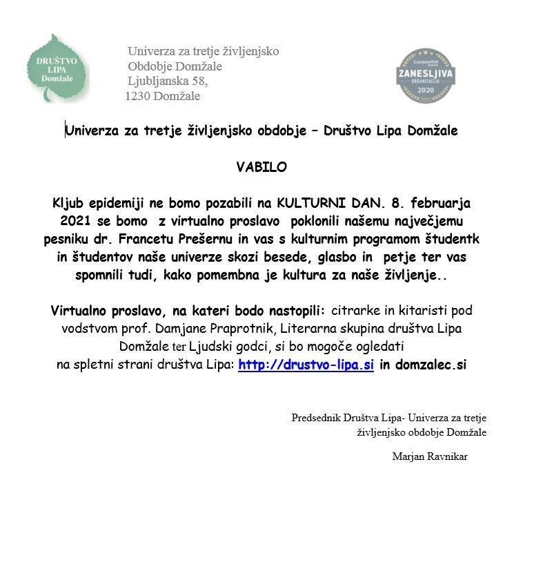 Univerza za tretje življenjsko obdobje - Društvo Lipa Domžale vabi na virtualno proslavo ob KULTURNEM DNEVU. Virtualno proslavo si bo mogoče ogledati na spletni strani društva Lipa:http://drustvo-lipa.si in domzalec.si.