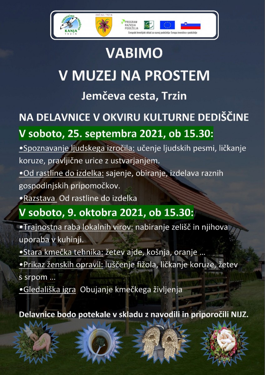 Vabljeni na DELAVNICE V OKVIRU KULTURNE DEDIŠČINE v MUZEJ NA PROSTEM, Jemčeva cesta, Trzin, v soboto, 25. septembra 2021, ob 15.30: