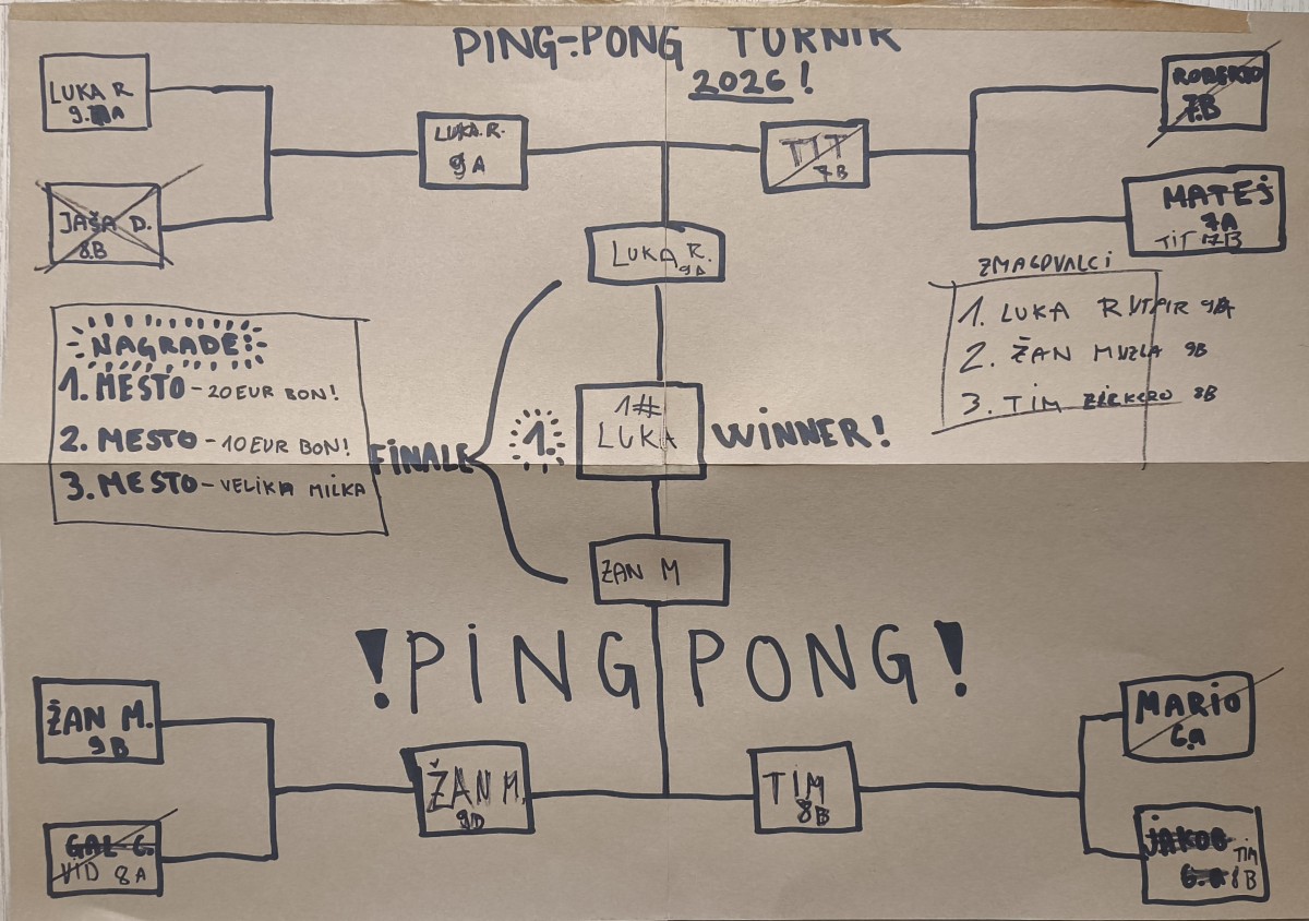 V Trzinu je bil v nedeljo, 1. 2., med 12.30 in 14.00 uspešno izveden ping pong turnir za učence tretje triade Osnovne šole Trzin. Turnir je potekal v novi športni dvorani, kjer se je pomerilo 8 posameznikov. Tekmovanje je potekalo po sistemu izpadanja. Turnir je organizirala mlajša ekipa Mladinskega kluba Trzin: Lovrenc Kmetič, Žan Muzga, Tia Teslić, Aleks Suhadolec in Oskar Dolinšek.