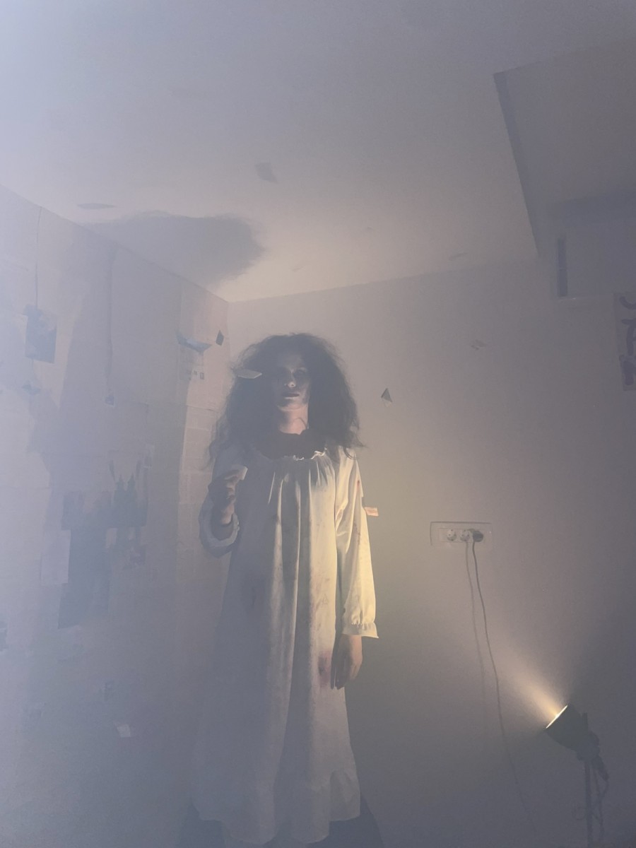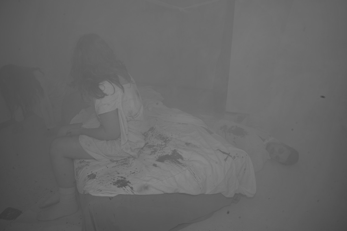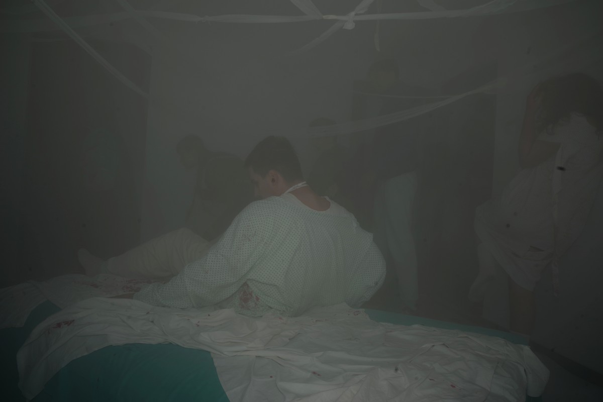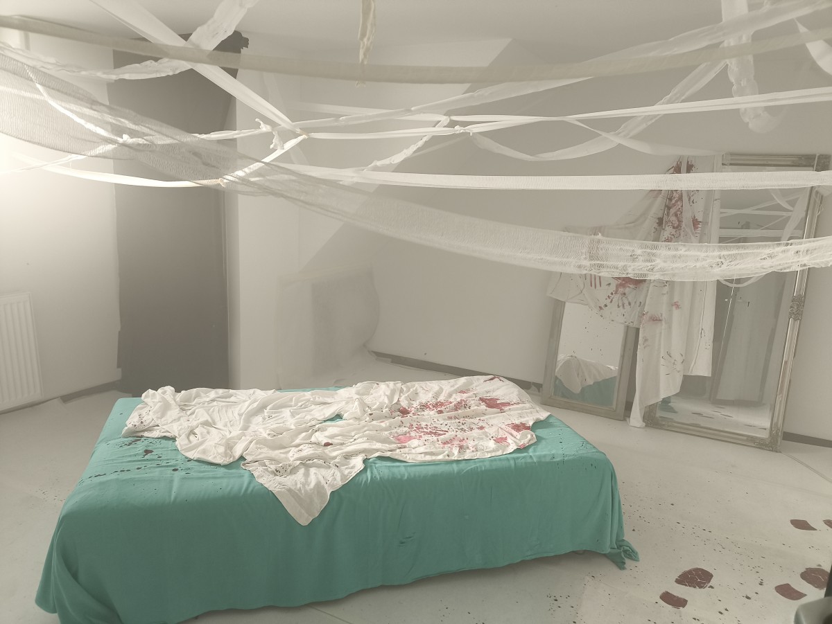 V oktobru so pričeli z delom v prostoru, kjer so s pomočjo zbranih materialov ustvarjali posamezne sobe in postavitve. Projekt je povezal tudi več lokalnih deležnikov. Filc Mengeš je doniral bel filc, uporabljen pri prostorski postavitvi. UKC Maribor je prispeval odslužene zdravniške obleke in opremo, ki so služile kot rekviziti in kostumi (zahvala Darinki Robnik). Civilna zaščita Trzin pa je posodila postelje, ki so poskrbele za pristno podobo umobolnice.