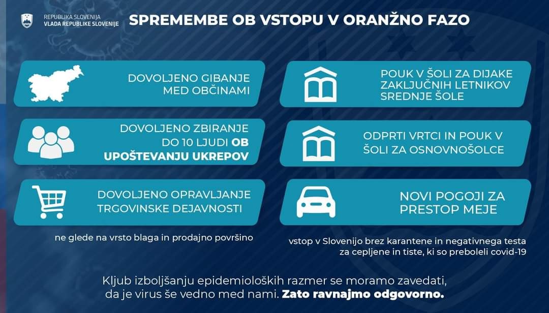 Ob izpolnjevanju kriterijev, pod 1000 hospitaliziranih ter manj kot 1000 novih primerov za povprečje zadnjih sedmih dni, smo v zvezi z obvladovanjem epidemije COVID-9 prešli v t. i. oranžno fazo, skladno s predvidenim načrtom sproščanja ukrepov tako od ponedeljka, 15. februarja 2021 velja: