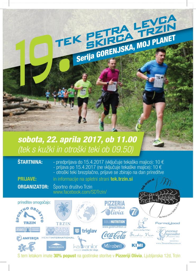 Vabljeni na 19. Tek Petra Levca Trzin, sobota, 22. aprila 2017, ob 11.00 uri. Tek s kužki in otroški tek ob 9.50.